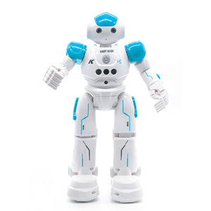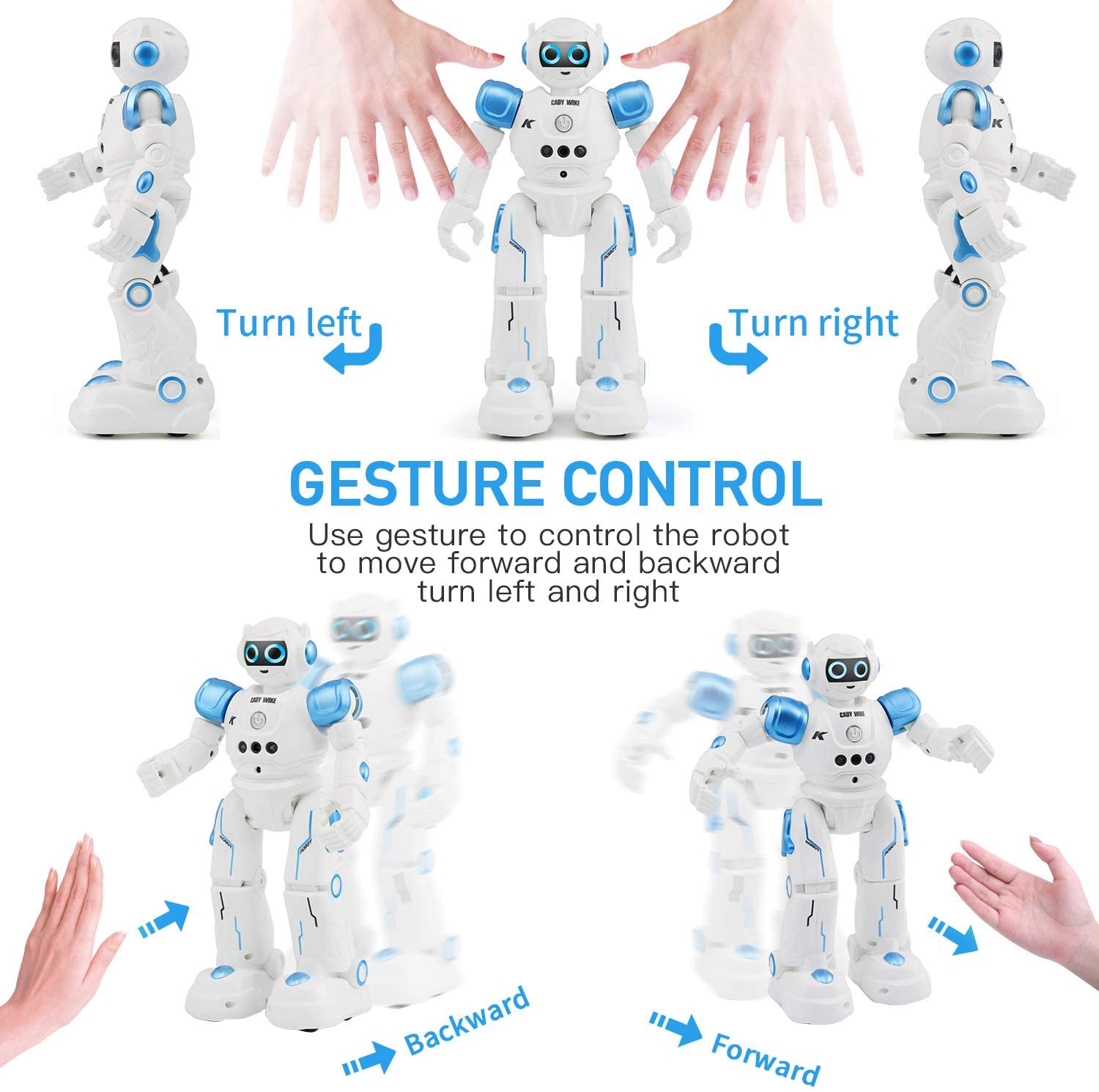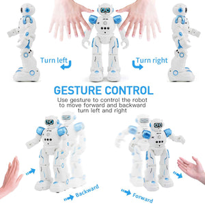 - Upgraded 3 control modes: Remote Control, Gesture Sensing Mode and Touch Response Mode. This gesture sensing robot not only can be controlled by infrared controller, but also can turn left ,turn right, slide backward, and slide forward according to how your hand gesture commands. Multi function includes auto display and obstacles avoidance as well. The toy robot’s eyes light up with bright blue illuminating LED when it moves.