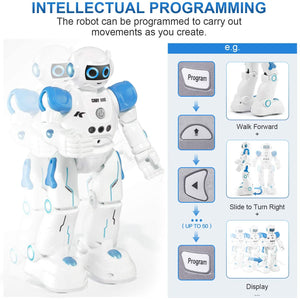 - Intelligent Programming: This smart robot toy can demonstrating a set of 50 actions inputted by the user. If you switch programming function, this Interactive robot will playback using its moves record feature to repeat the movement one by one as you created like turn left-turn, right walk, forward walk, backward, patrol, dance and many others action mode you selected.