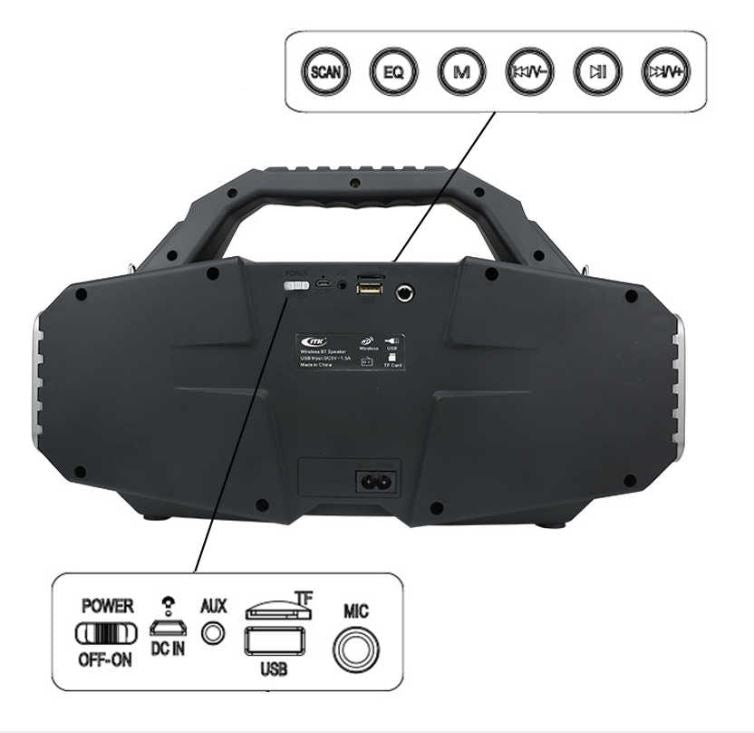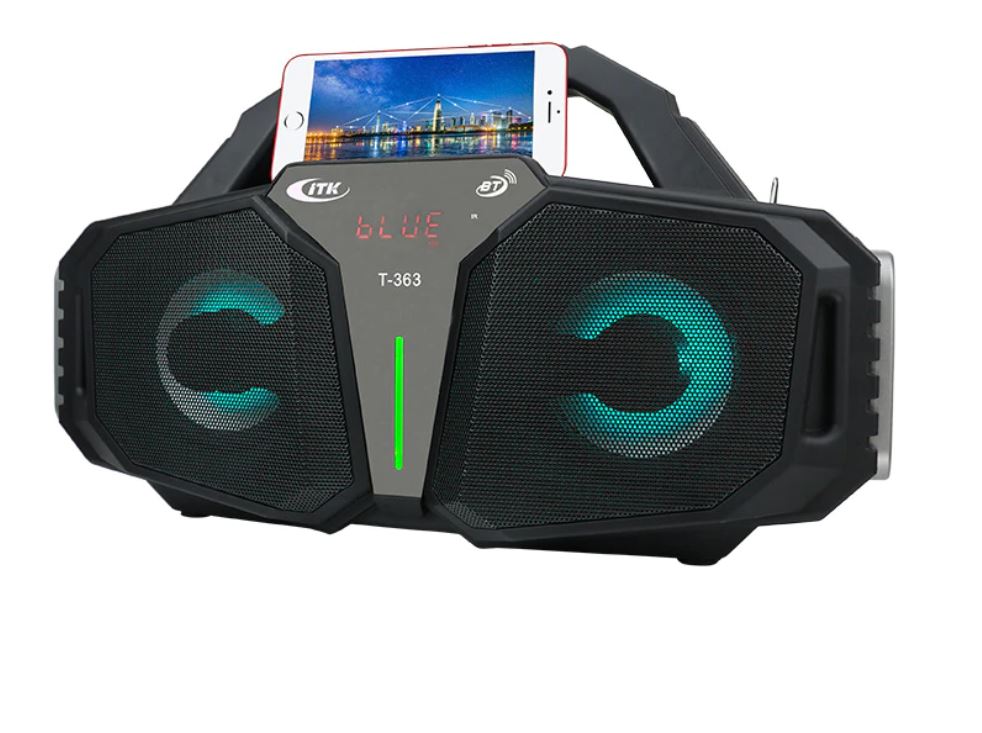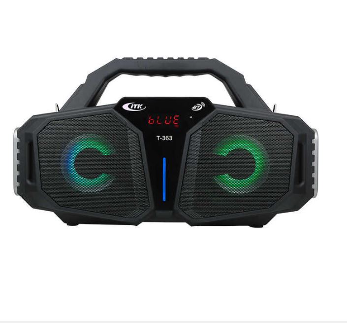 - This speaker ITK T363, with FM, Bluetooth, TF, USB, AUX, and other full-featured. Dual 4-inch, 7.4V / 30W, 18650 / 3000MAH battery, playback time 5-8 hours.