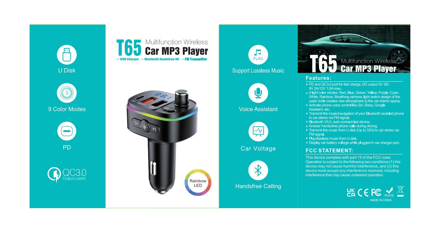Multifunction Wireless Car MP3 Player W/Dual USB & Type C Charger (T65)