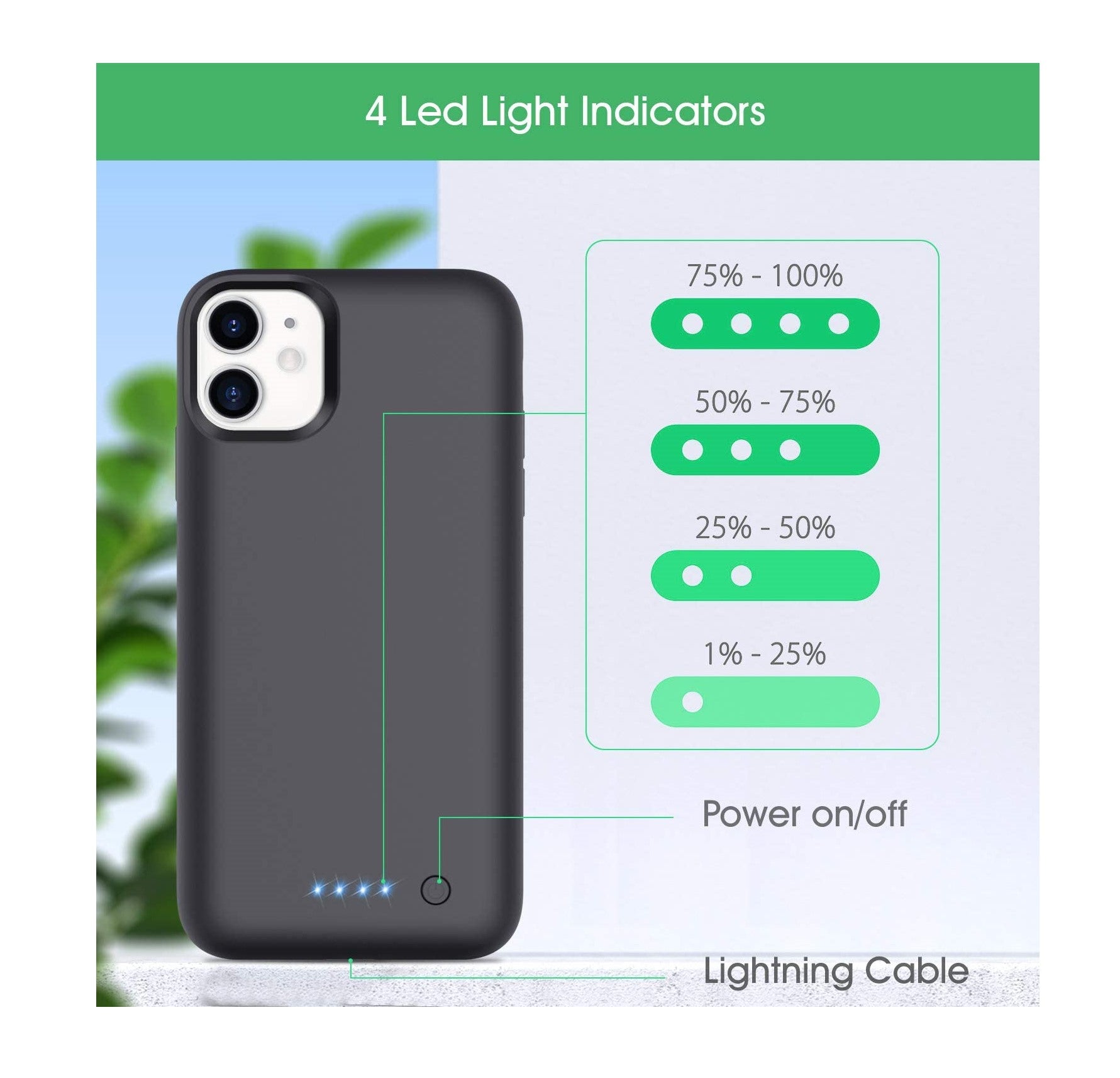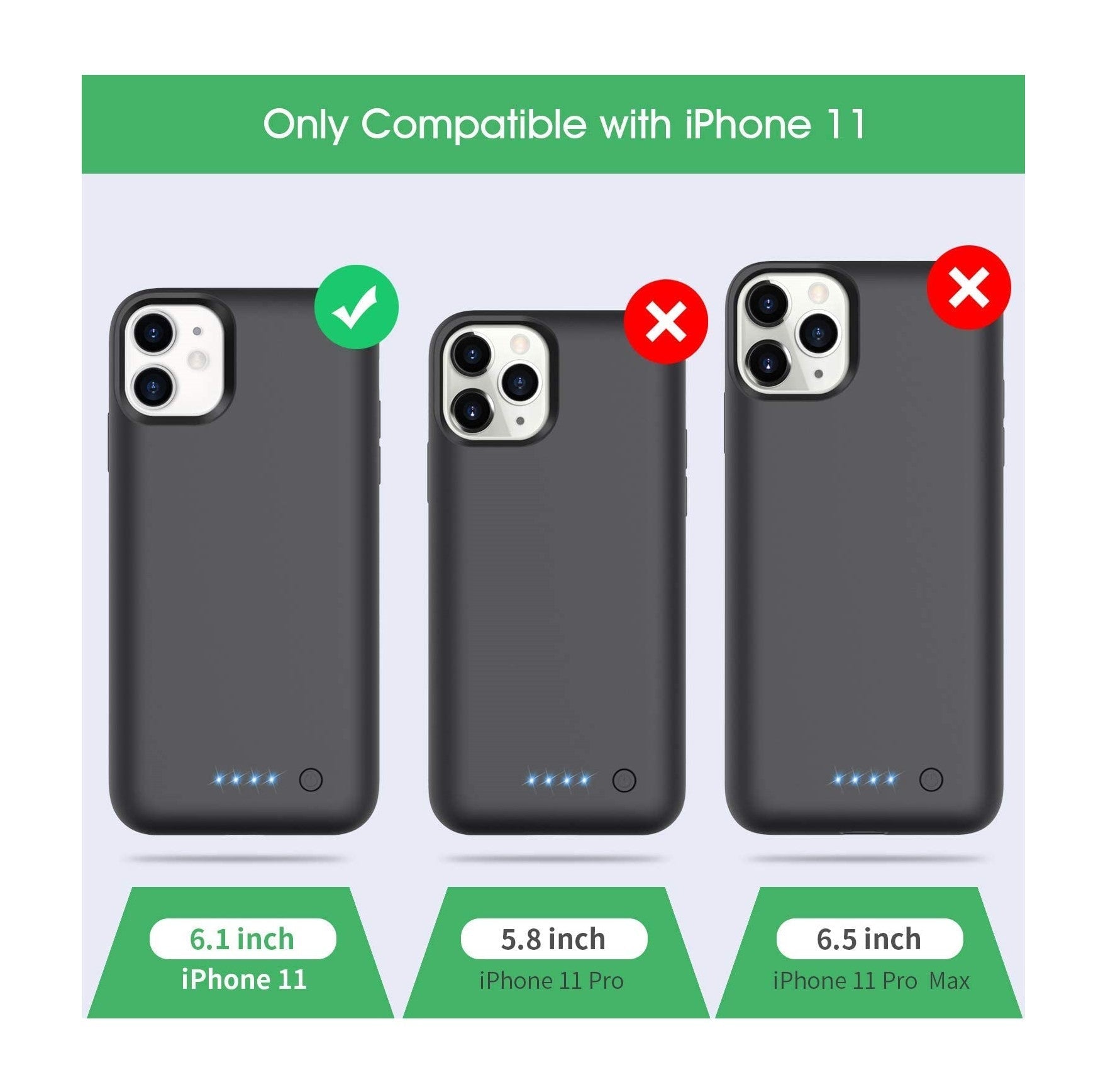 - Suitable only for iPhone 11: This smart battery case is only compatible with iPhone 11, not for iPhone 11 Pro or iPhone 11 Pro Max . 4 blue indicators show the power left as 25% - 50% - 75% - 100%, and high-quality battery chips can protect your iPhone 11 from overcharging, short-circuiting and overheating.
